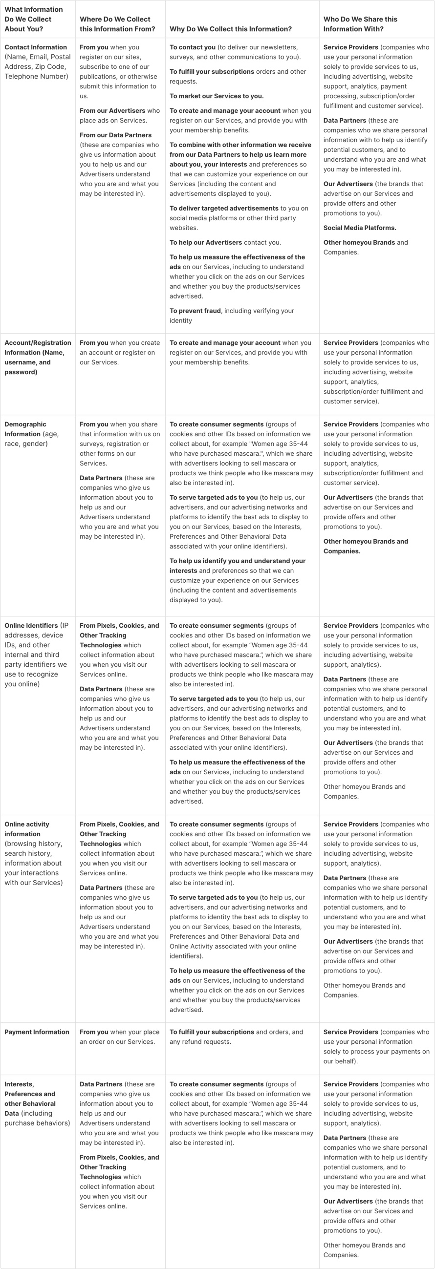 | What Information Do We Collect About You? | Where Do We Collect this Information From? | Why Do We Collect this Information? | Who Do We Share this Information With? |